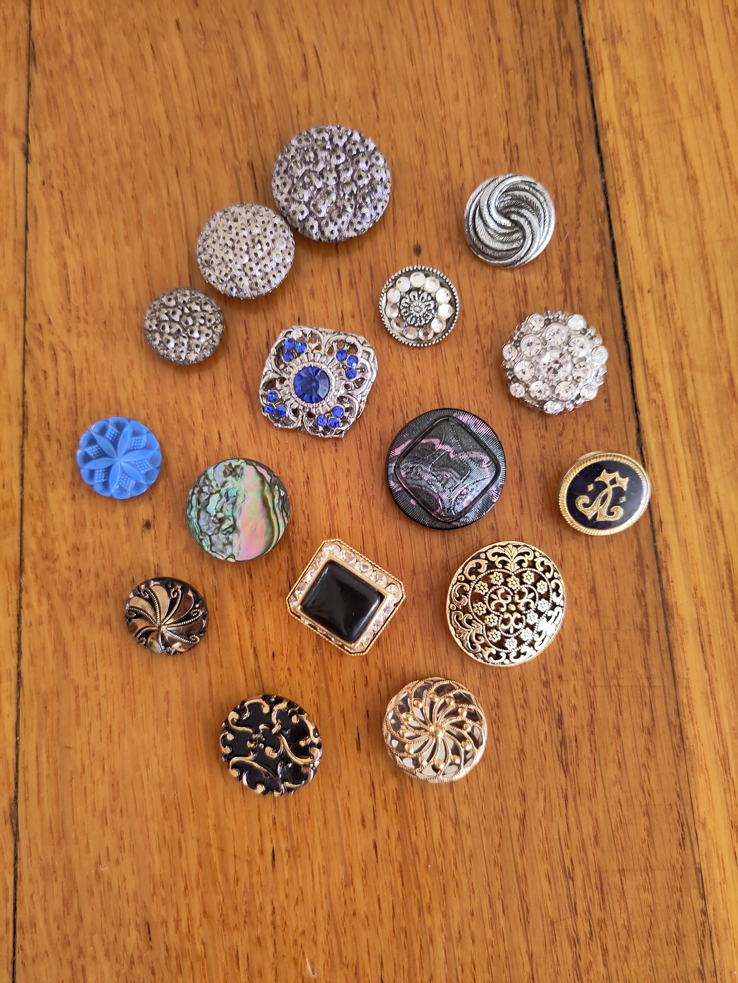 Goudkleurige knopen uit de jaren ’80, die het licht vangen als een warme gloed bij zonsondergang.
