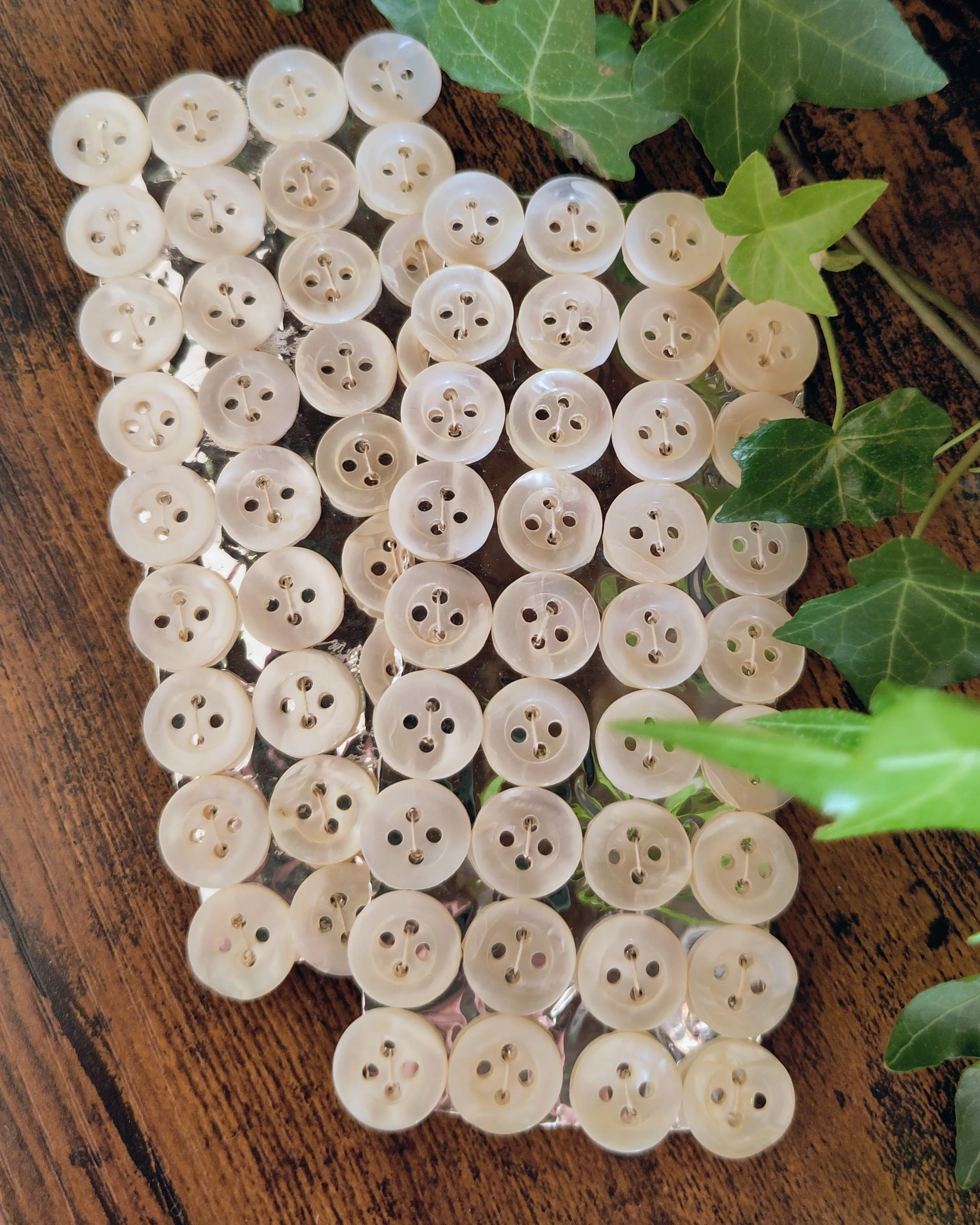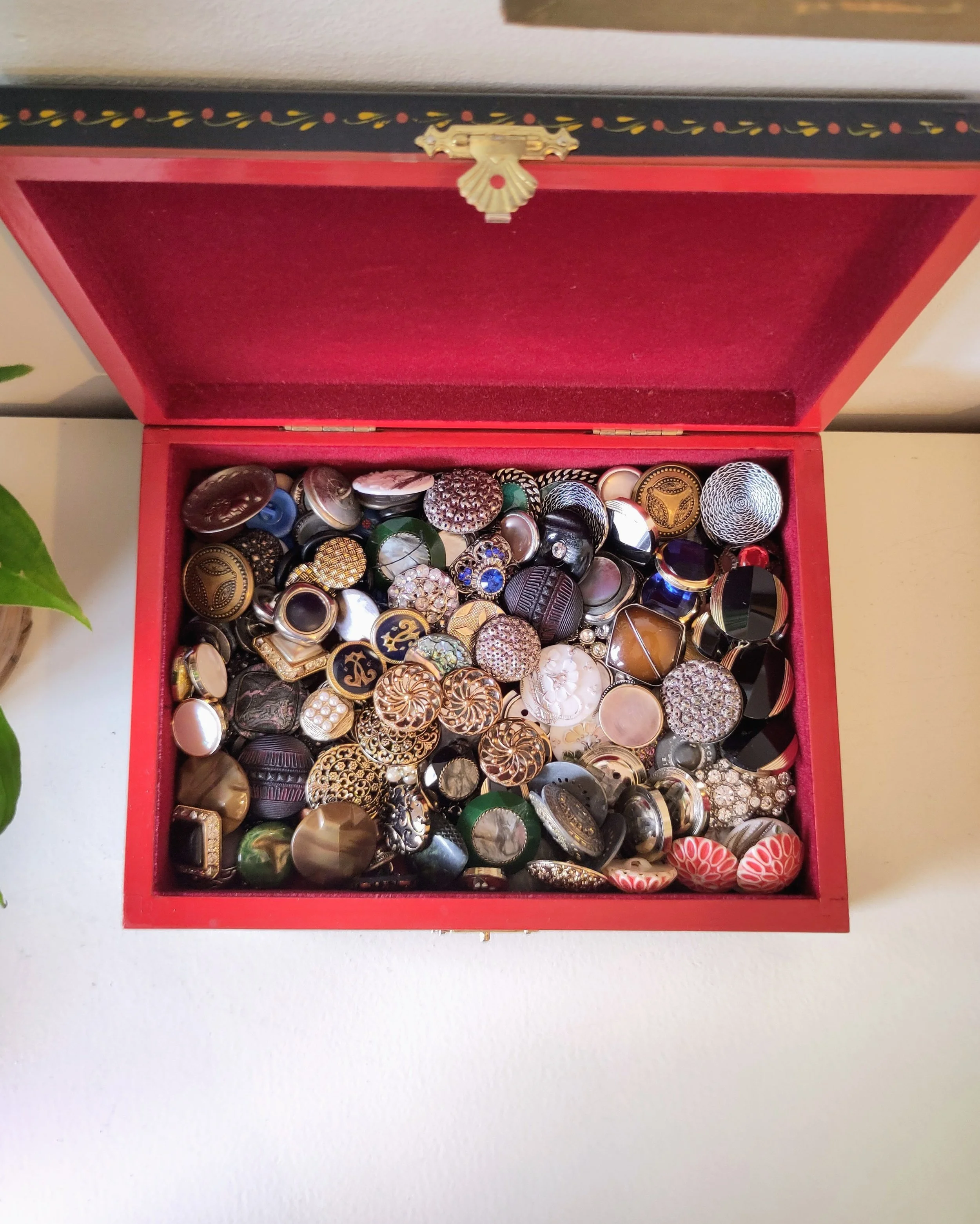 Binnenin vond ik een chaotische maar prachige collectie aan vintage en antieke fournituren. Vooral knopen, van glas, metaal en vroege kunststoffen, elk met hun eigen vorm en karakter.
